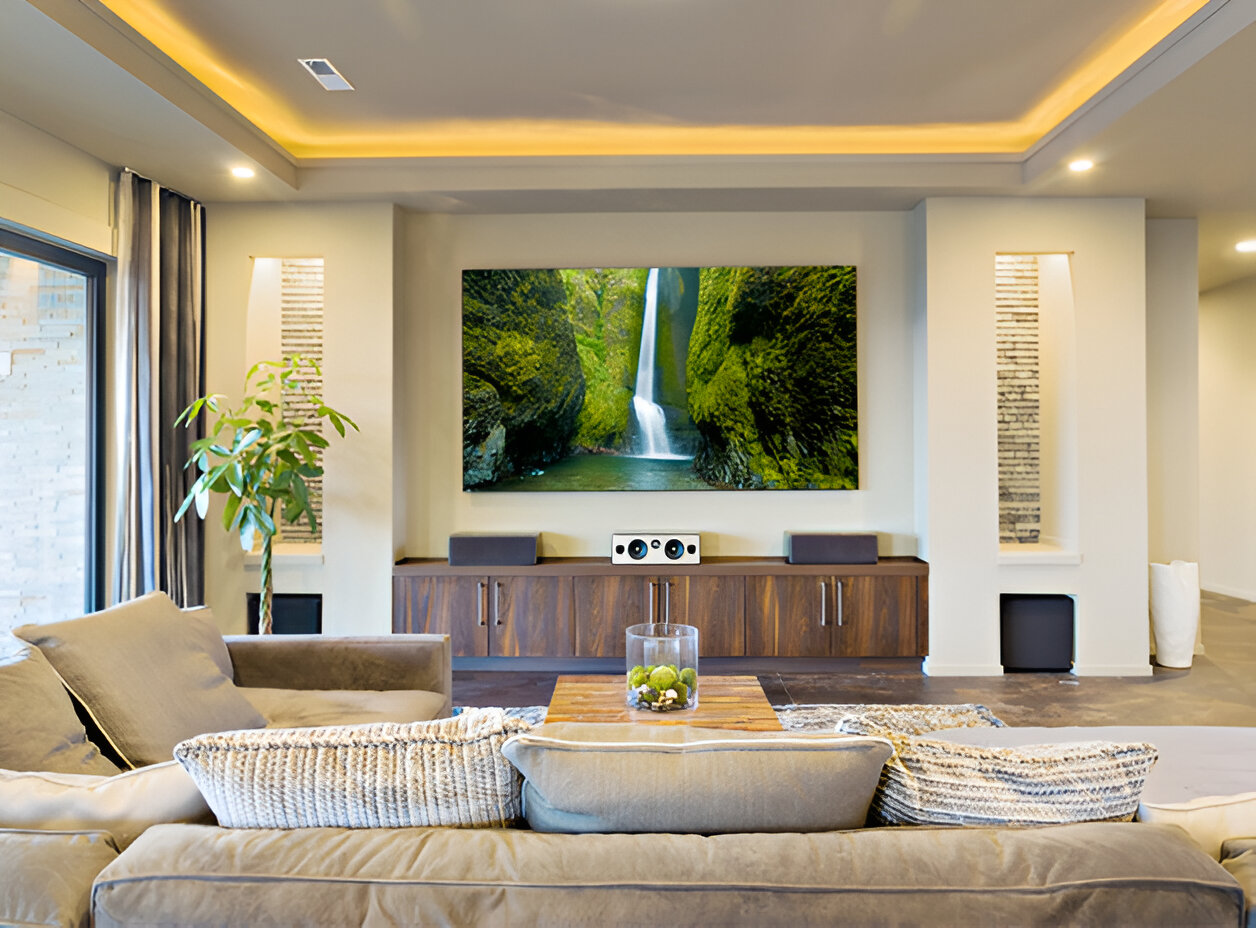 Our home theater services include architecture, furnishings, lighting, acoustics, and installation, creating an immersive and comfortable cinematic experience.